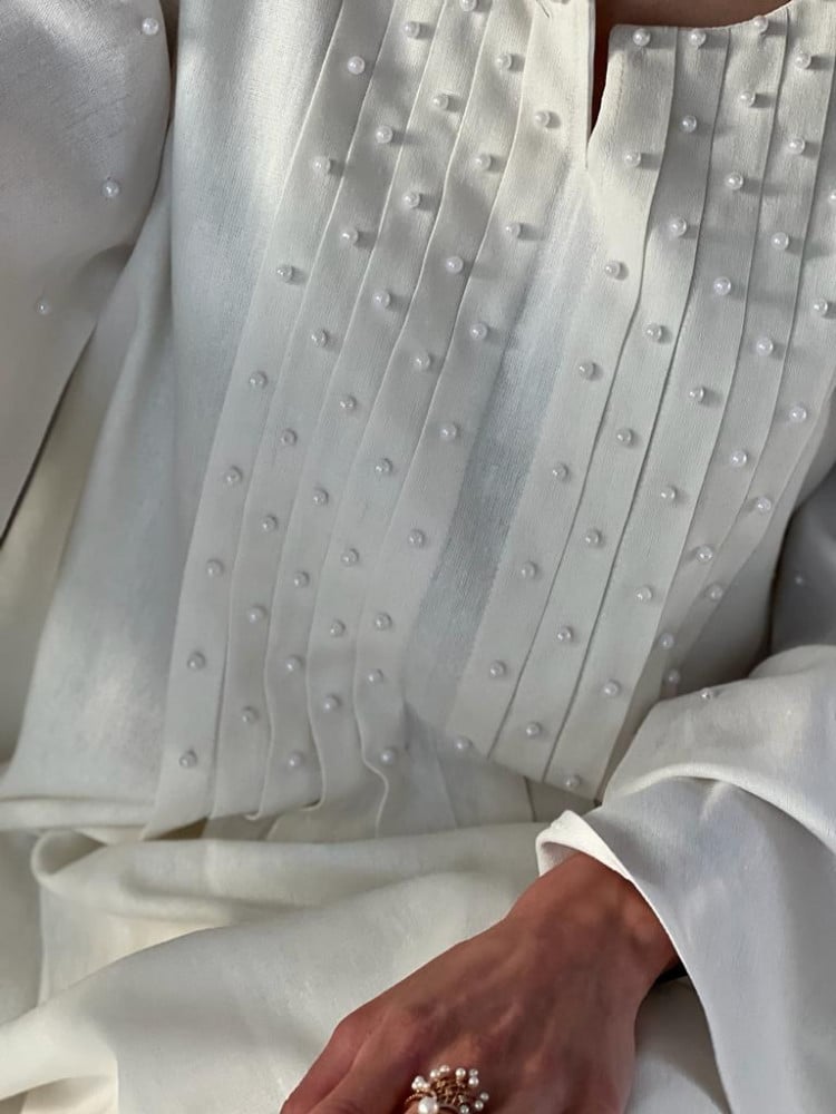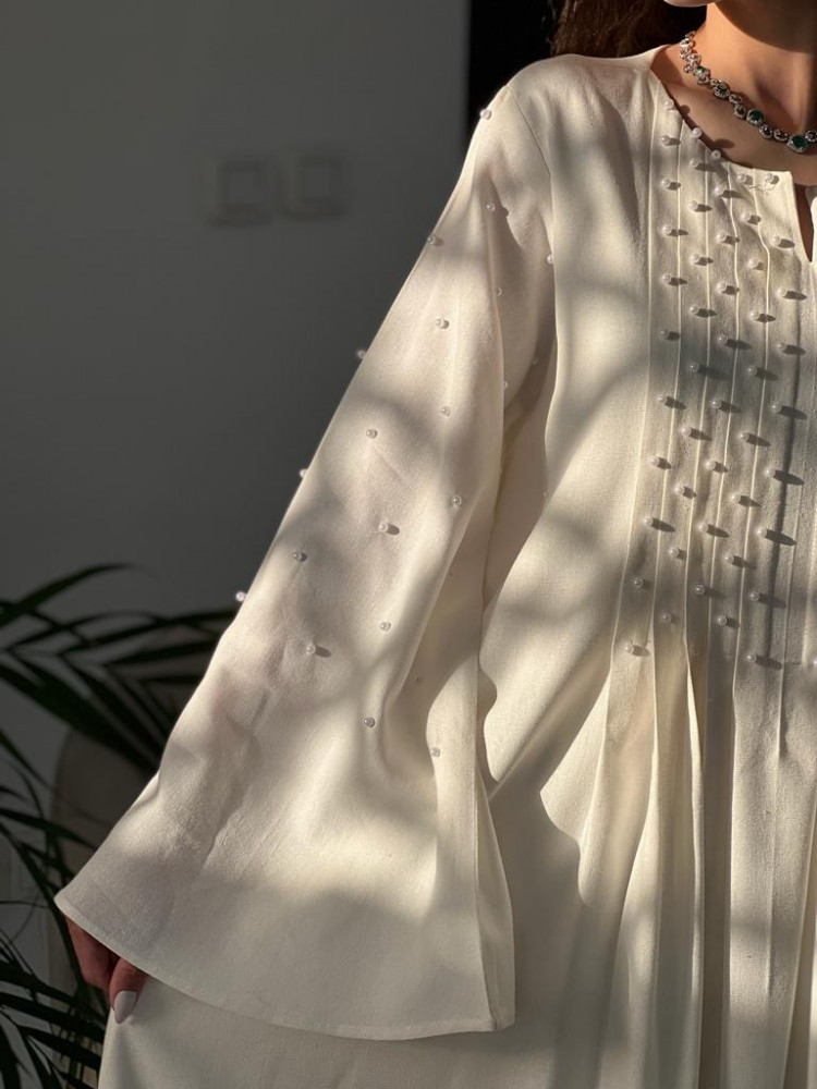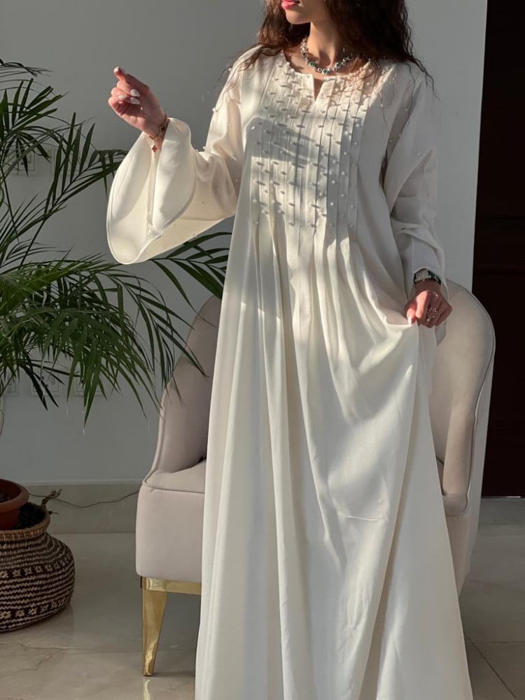جلابية صيفية باردة فاخرة القماش لنن سكري وعلى الصدر والأكمام شك لولو