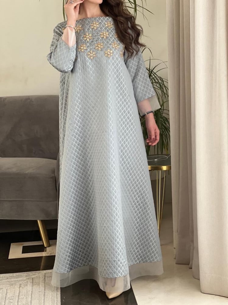 جلابية فاخرة القماش تفته سماوي وعلى الصدر شك ذهبي
