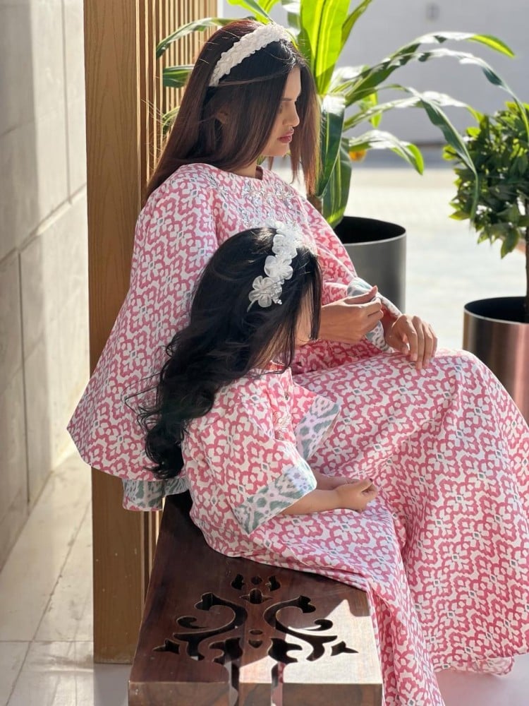 جلابية للأطفال اللون مشجر وردي مع شك فضي