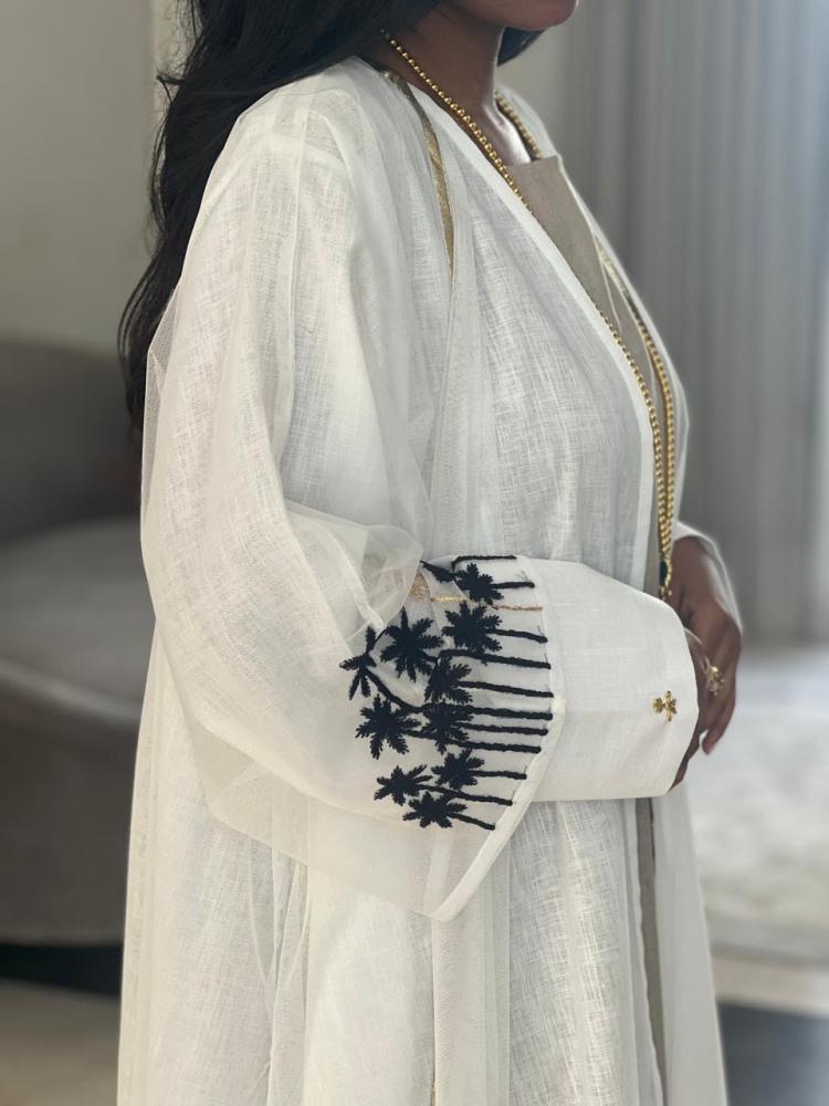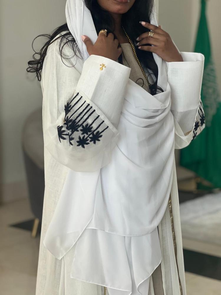 طقم 5 قطع ( عباية لنن ابيض - تل ابيض - فستان داخلي - طرحة - سلسال )