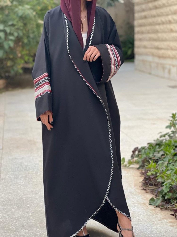 عباية اللون اسود محددة بقماش سدو وعلى والاكمام شك احمر