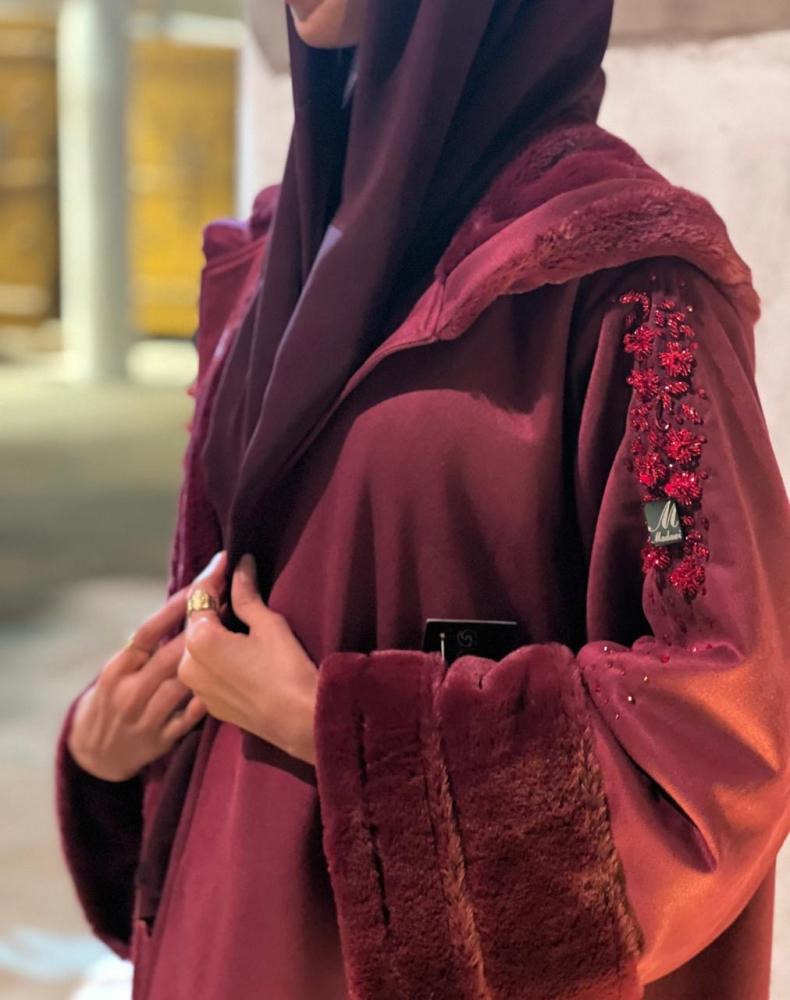 عباية شتوية القماش شامواة عنابي مع فرو وشك