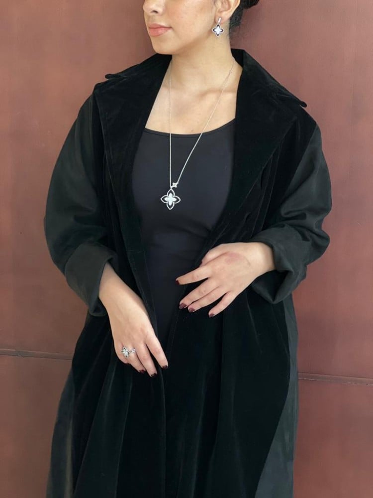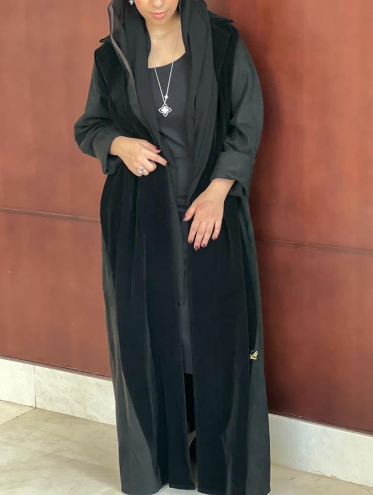 عباية شتوية عملية القماش شامواة اسود مع مخمل اسود