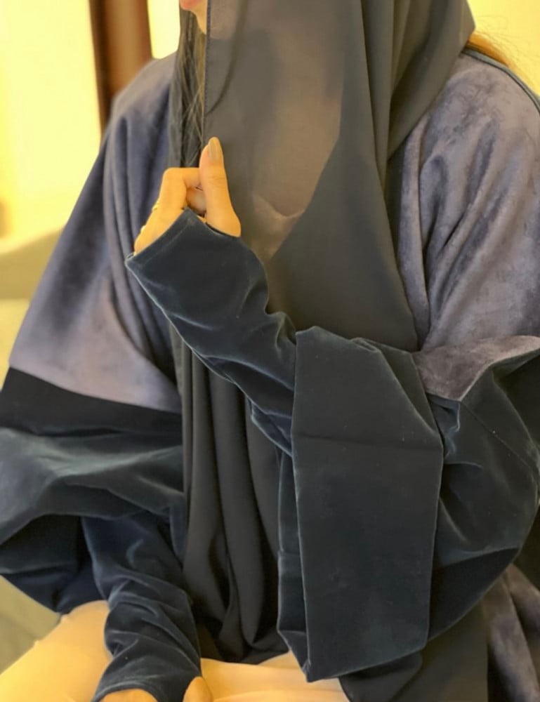 عباية شتوية عملية القماش شامواه كحلي والاكمام مخمل كحلي مع قلفز مخمل