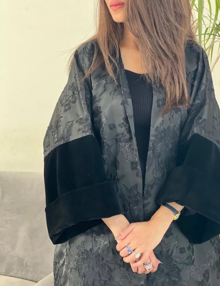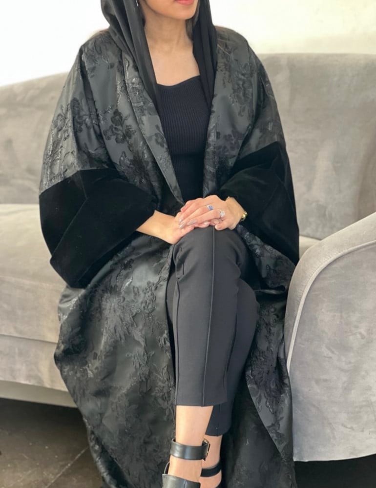 عباية شتوية فاخرة القماش تفته مشجر اسود والأكمام مخمل اسود