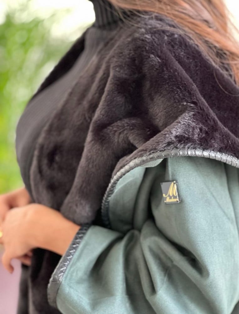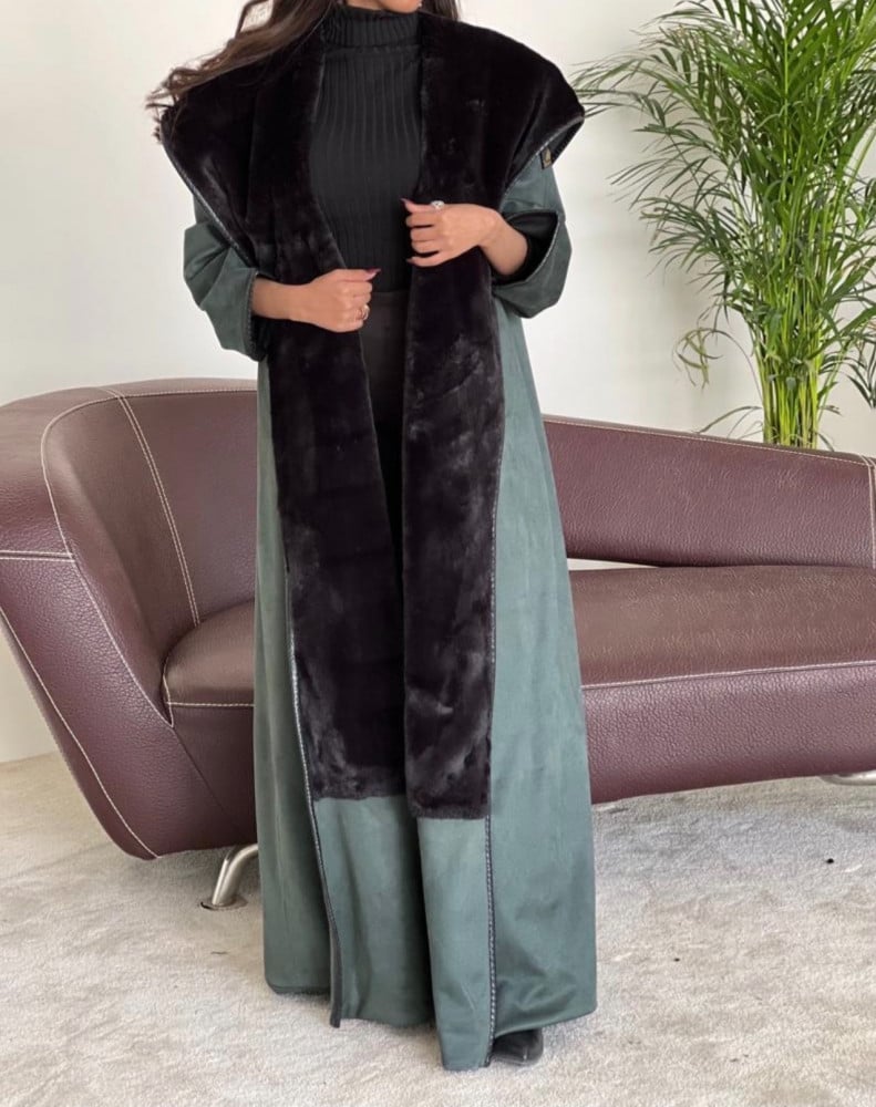 عباية شتوية فاخرة القماش شامواه زيتي مبطنه بفرو اسود ومحدده بجلد