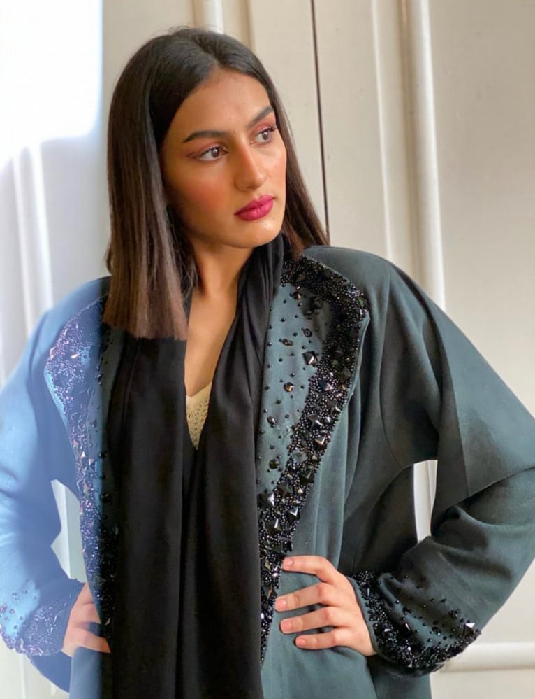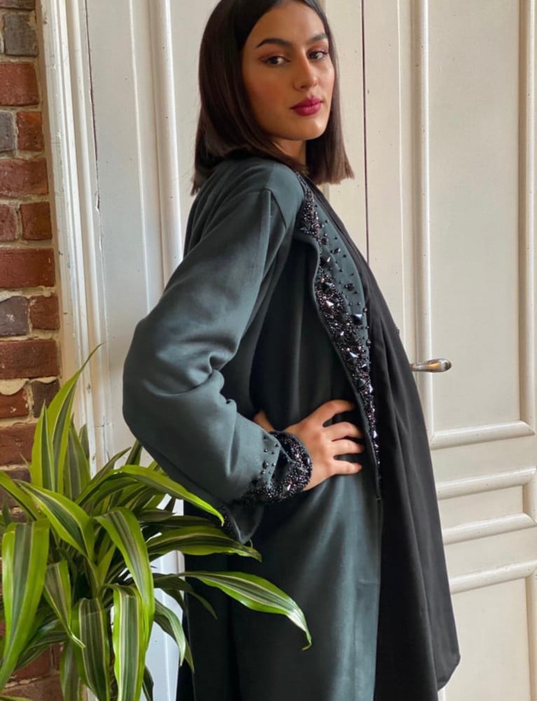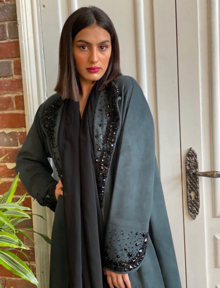 عباية شتوية فاخرة القماش شامواه زيتي وعلى الاكمام والقبه شك أسود