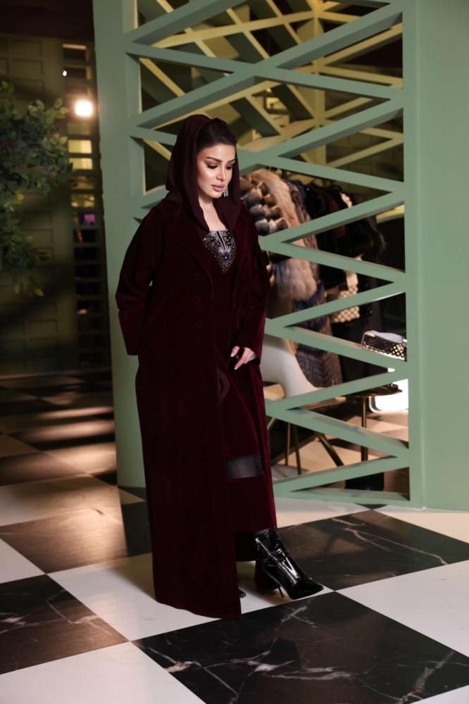 عباية شتوية فاخرة القماش مخمل عنابي ( طقم فستان وعباية وطرحة)