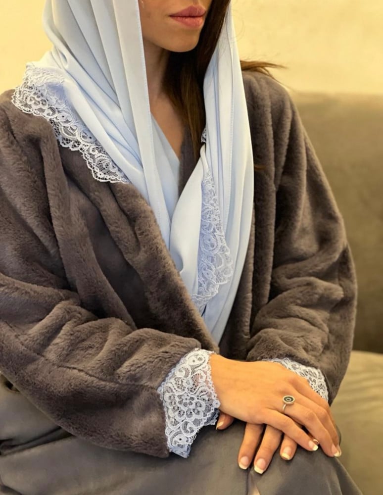 عباية شتوية فاخرة فرو رمادي غامق مع شامواه و الاكمام والطرحة محددة بدانتيل سماوي