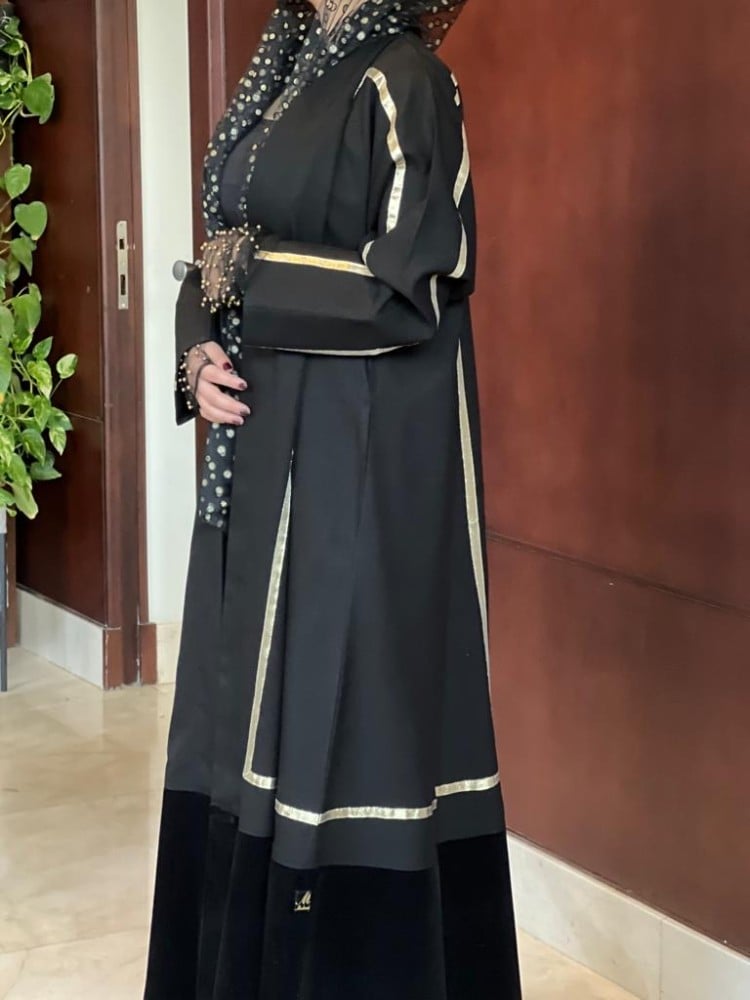 عباية شتوية فاخرة محددة ذهبي القماش كريب كتان اسود ومخمل اسود مع طرحة منقط ذهبي وقفاز شك ذهبي