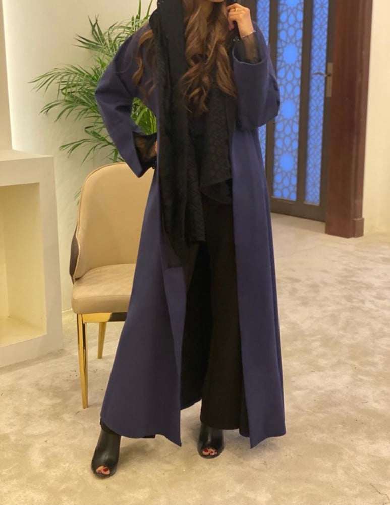 عباية شتوية مميزة القماش شامواه كحلي والاكمام تل مع شك كحلي والطرحة دانتيل اسود