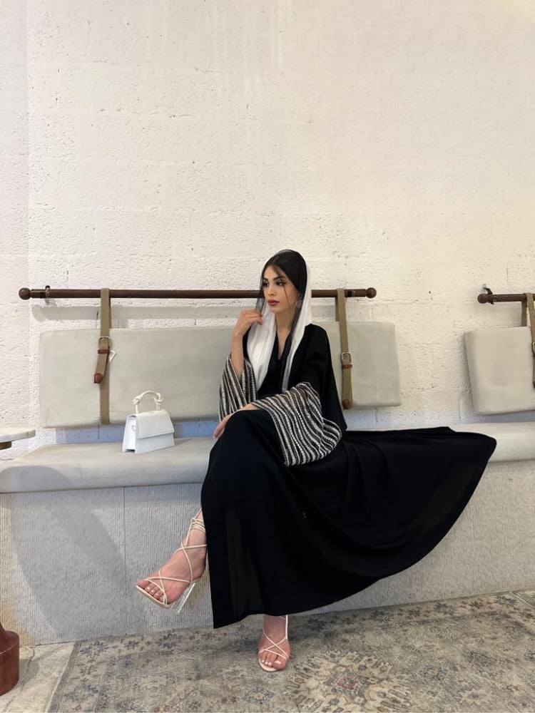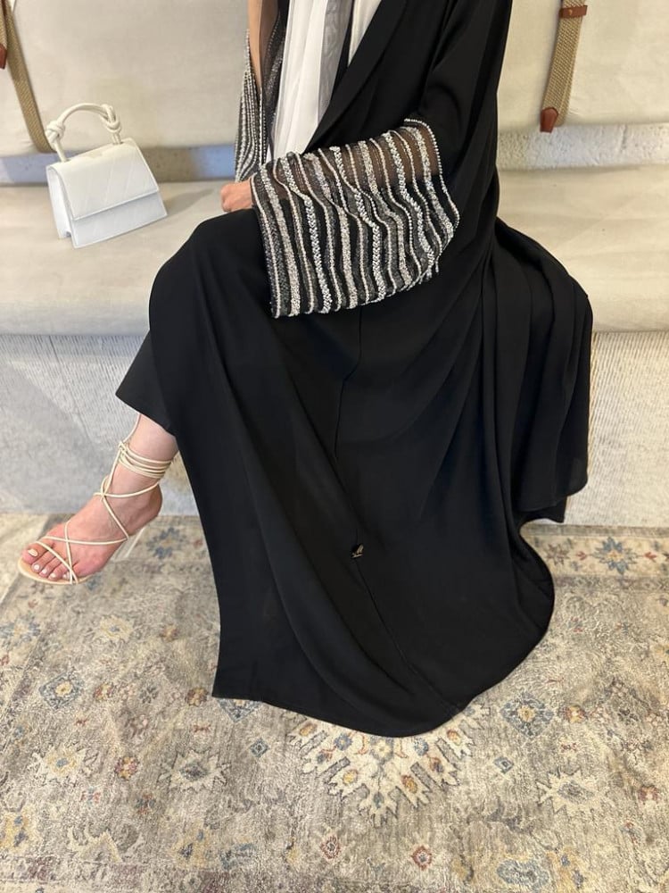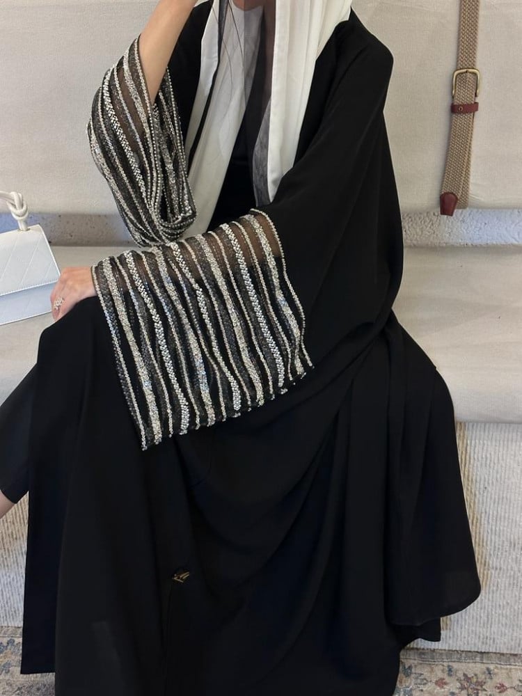 عباية صيفية باردة القماش كريب حرير اسود وعلى الأكمام شك