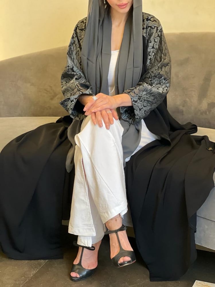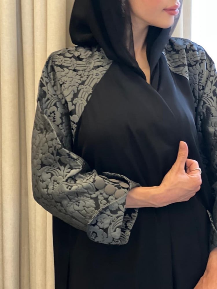 عباية صيفية باردة القماش كريب حرير اسود و الأكمام تفته اسود مشجر رمادي