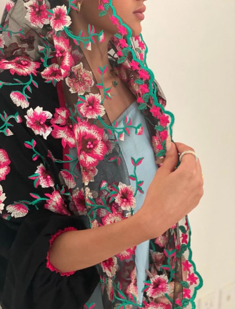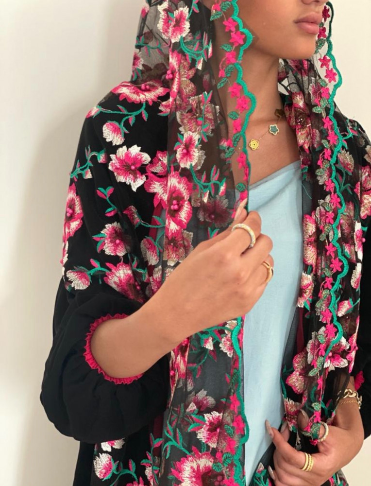 عباية صيفية باردة حرير اسود مع طرحة مشجرة