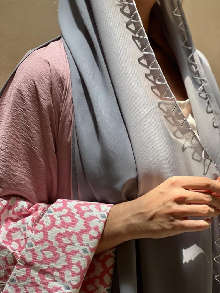 عباية عملية القماش كريب وردي و الأكمام تفته مشجر وردي و طرحة شك فضي