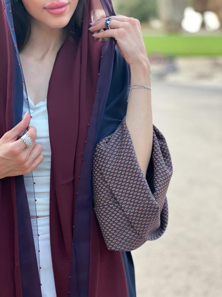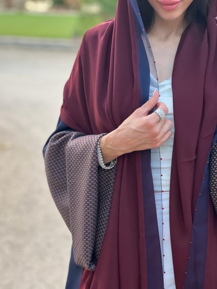 عباية عملية اللون كحلي و الأكمام عنابي مشجر و على الطرحة شك عنابي