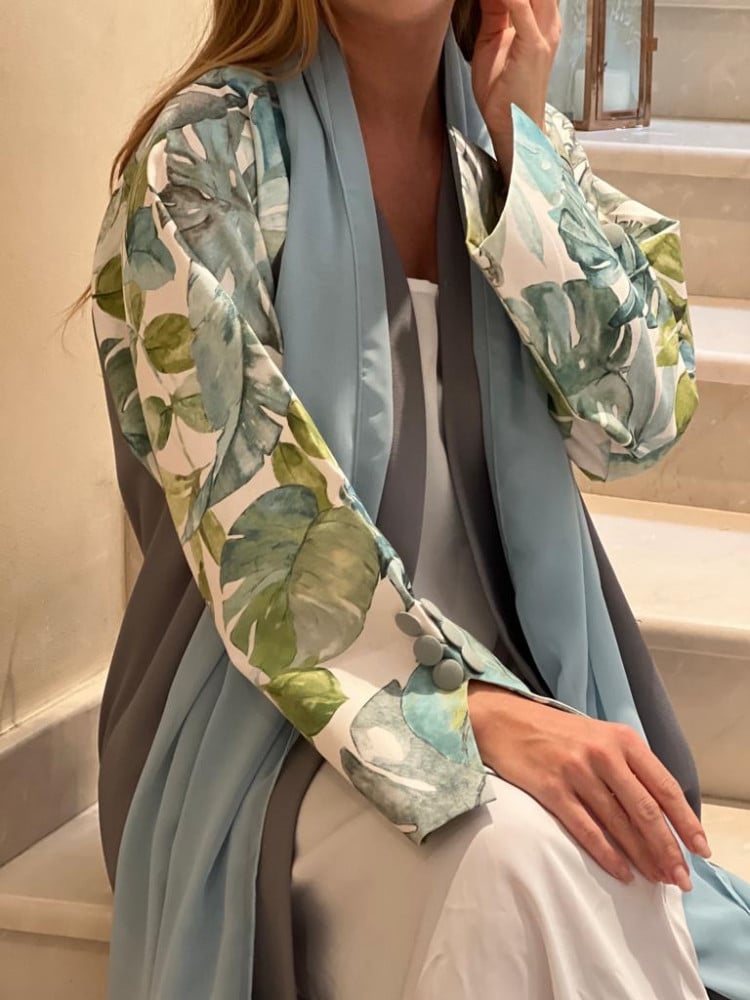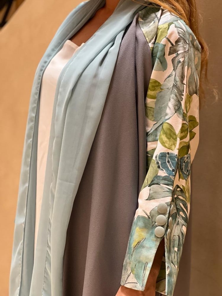 عباية عملية و مميزة اللون رمادي و الأكمام ورد تفته