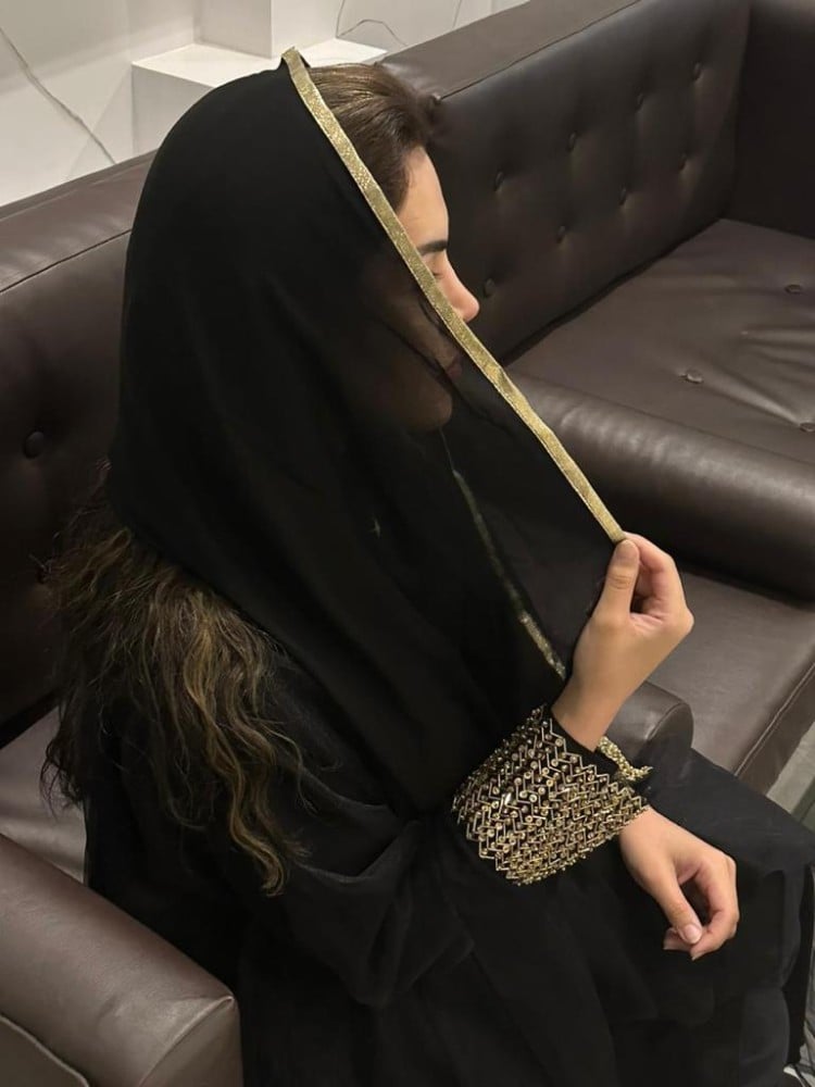 عباية فاخرة القماش طبقتين تل اسود وكريب حرير و على الأكمام شك ذهبي والطرحة محددة ذهبي