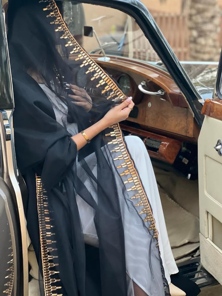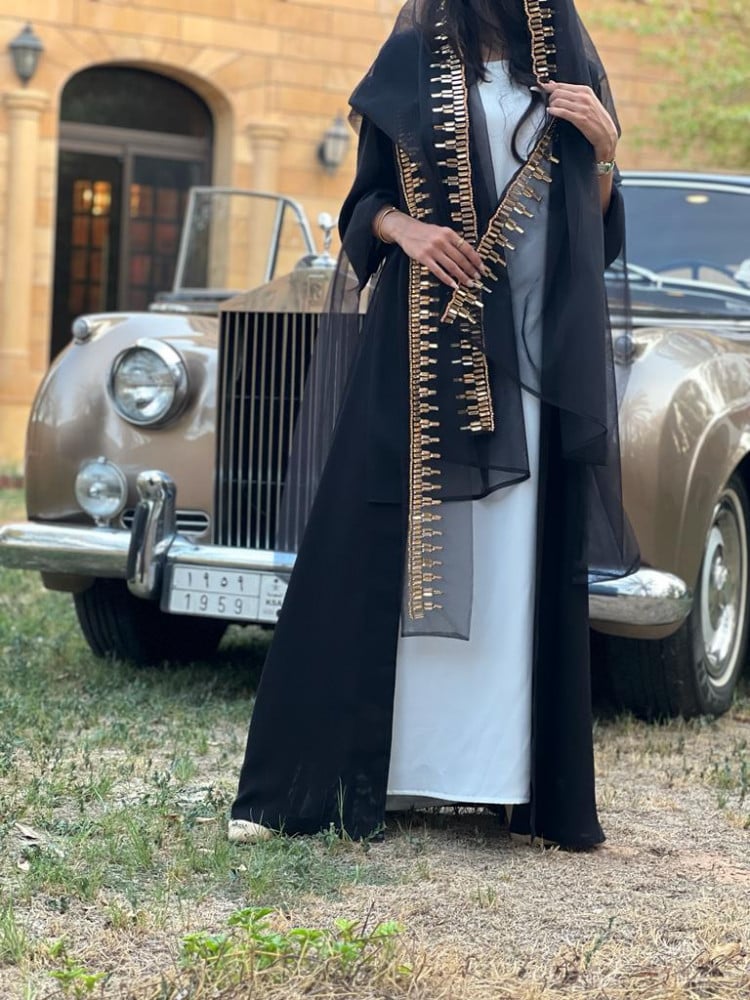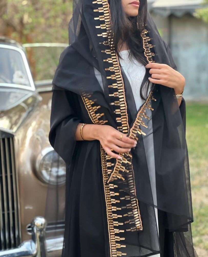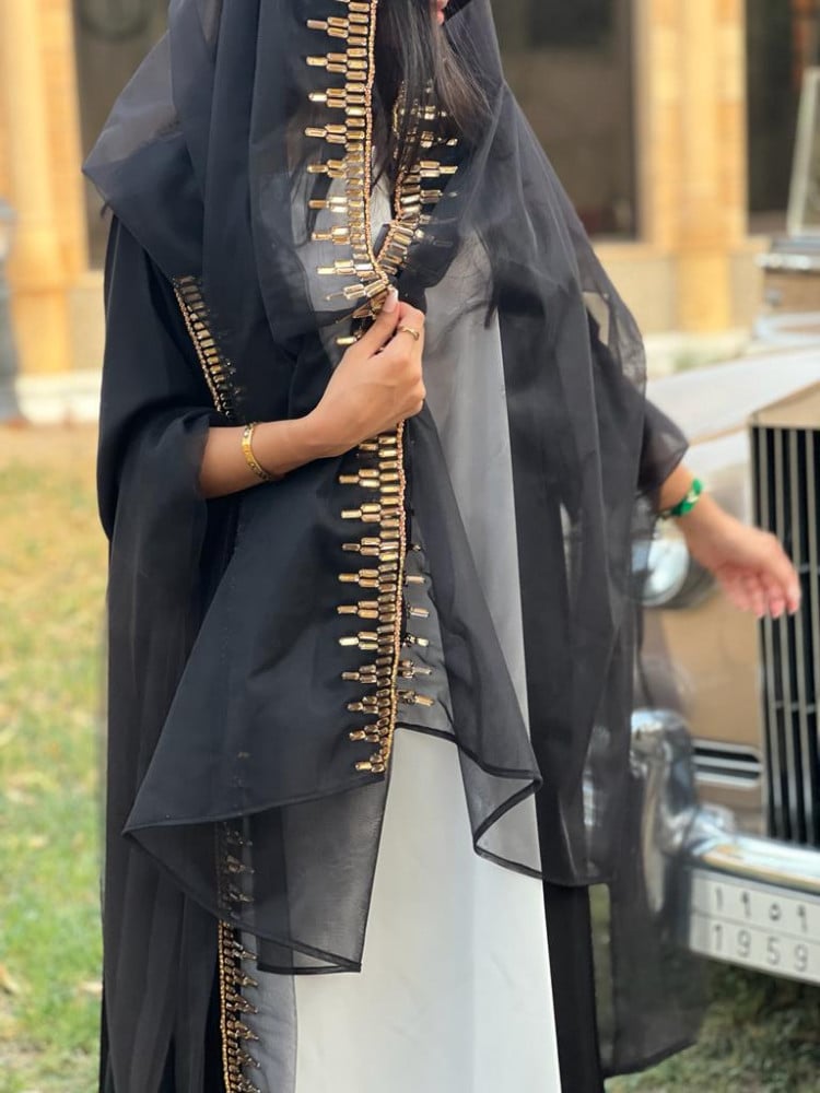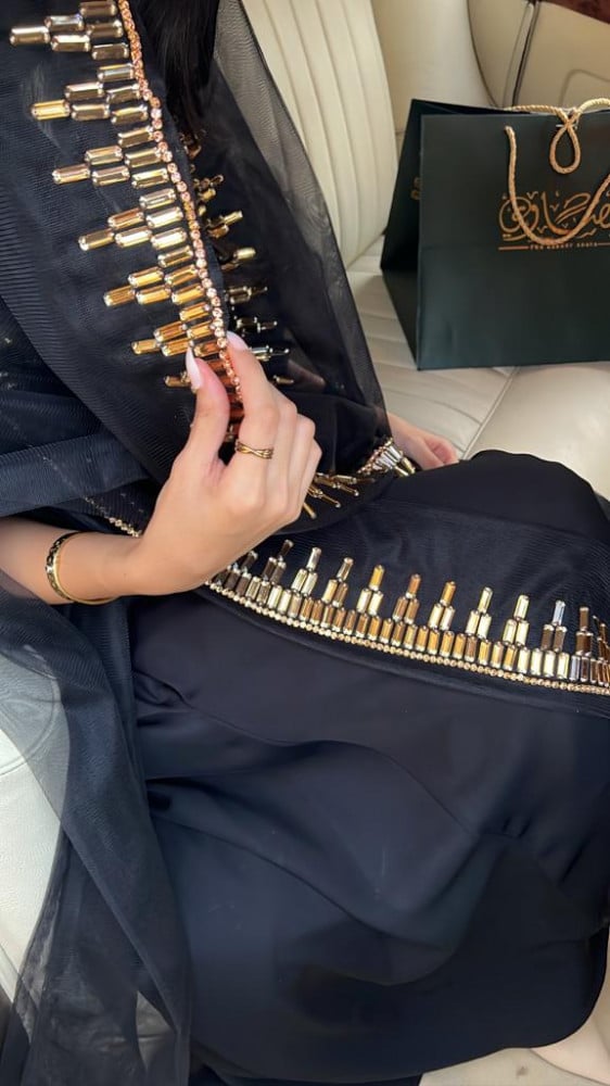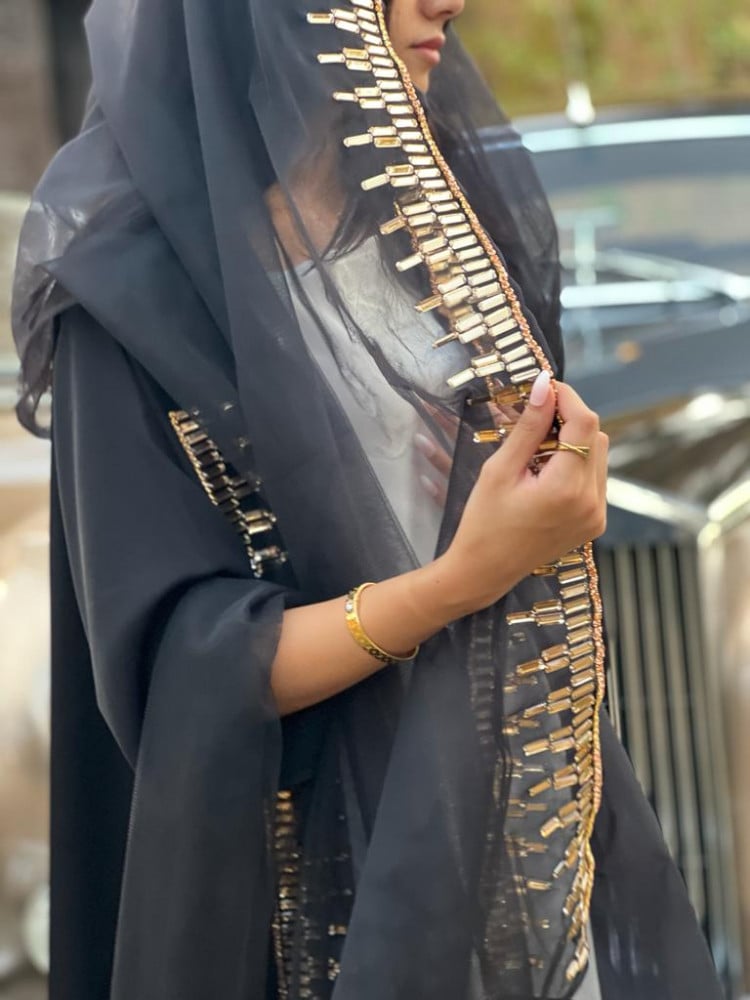 عباية فاخرة القماش كريب حرير اسود مع شك ذهبي و الطرحة والأكمام تل اسود