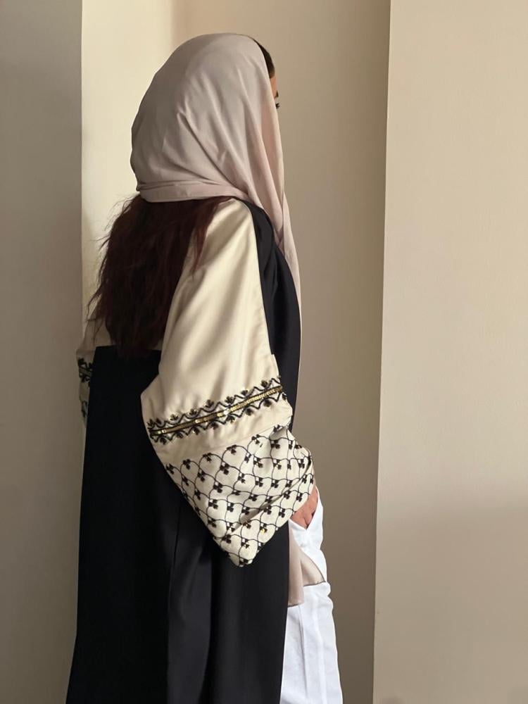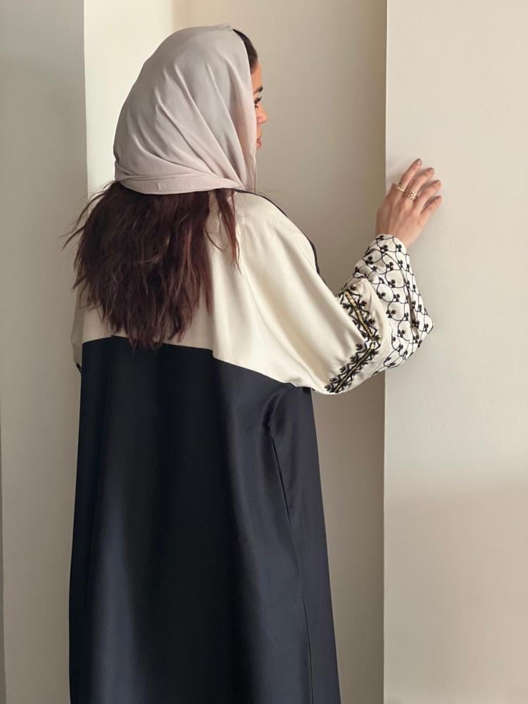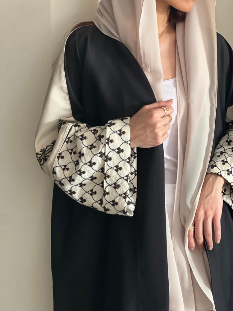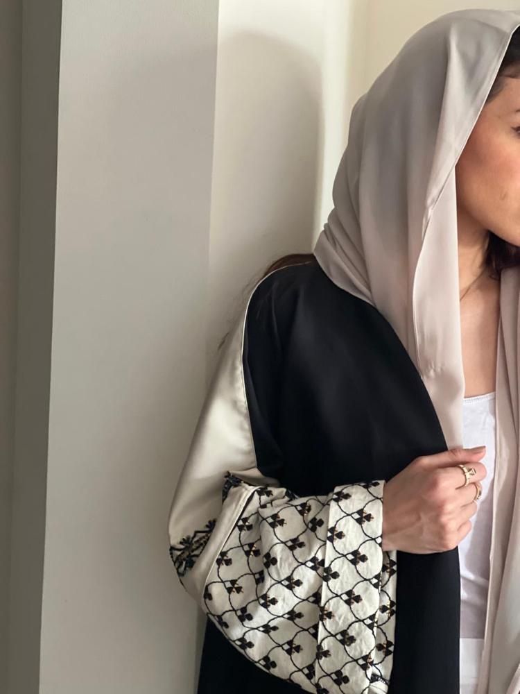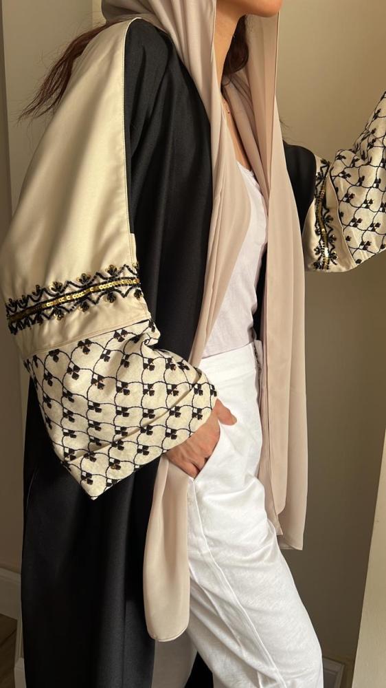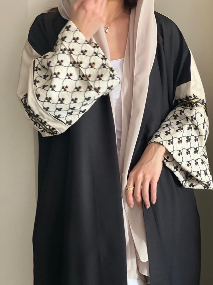 عباية فاخرة القماش كريب كتان اسود والاكمام لنن بيج مشجر اسود مع شك