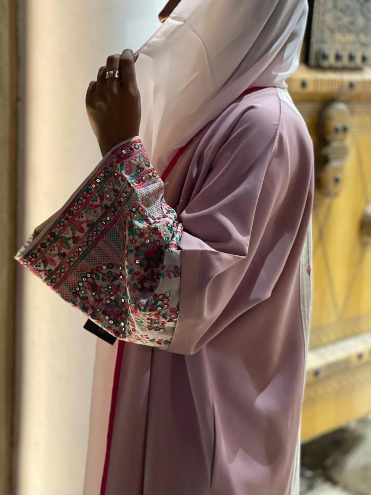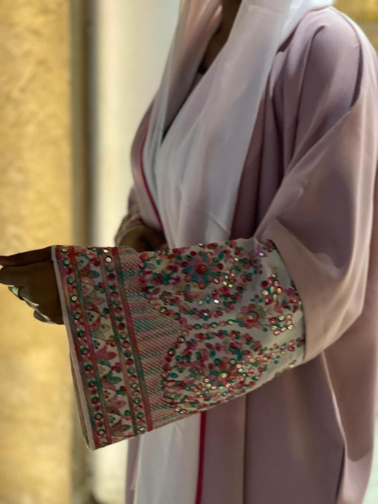 عباية فاخرة القماش كريب وردي والأكمام لنن مع شك وتطريز
