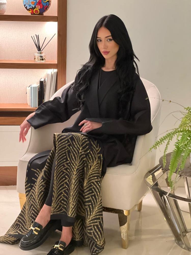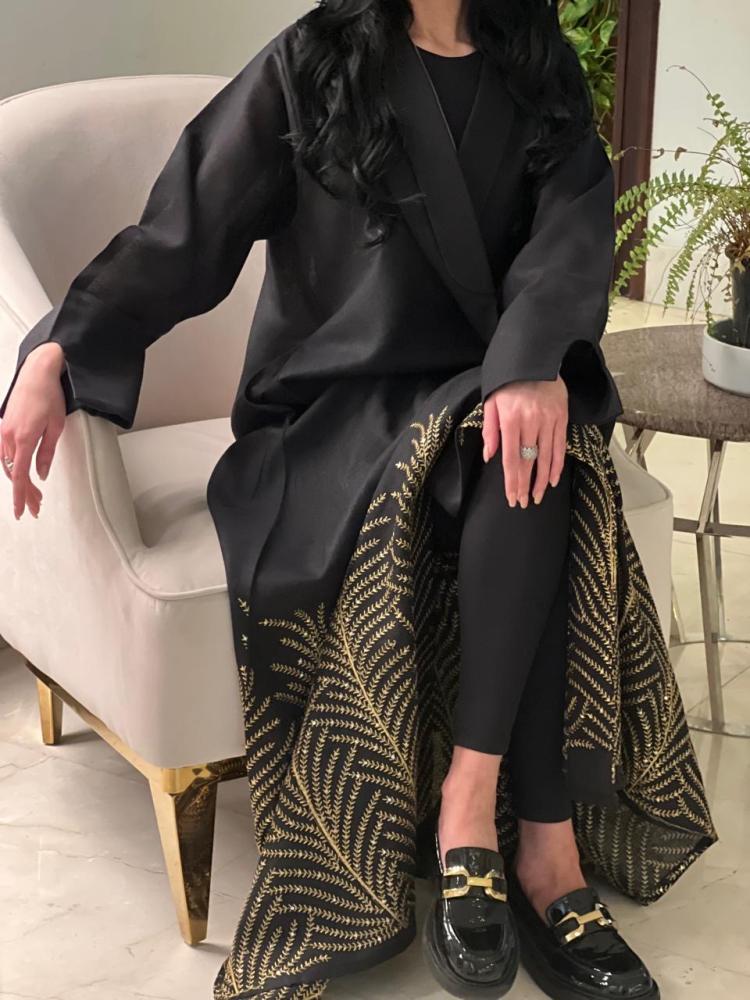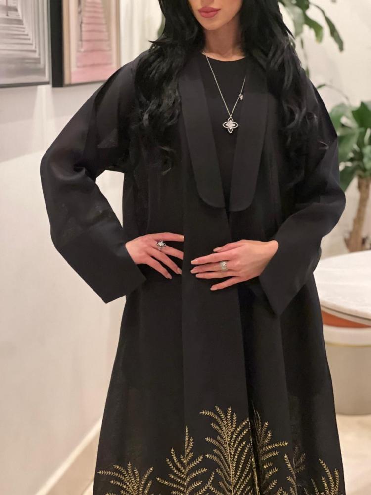 عباية فاخرة القماش لنن اسود مع شك وتطريز ذهبي