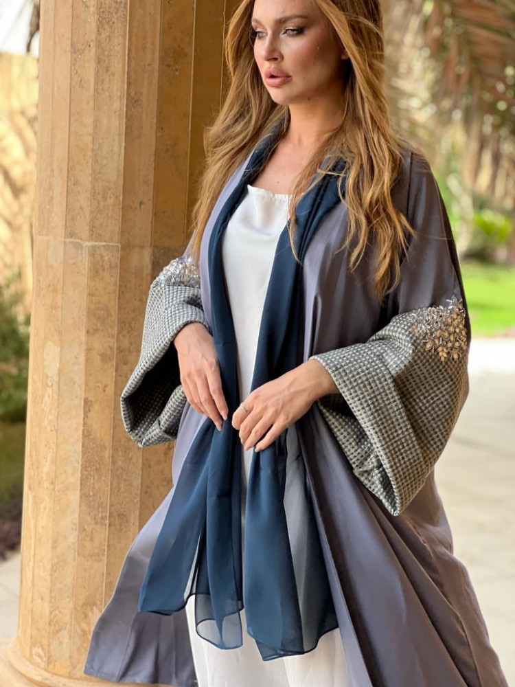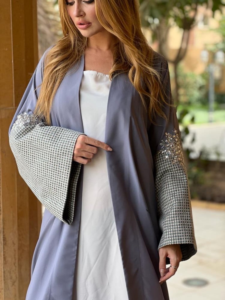 عباية فاخرة اللون رمادي و على الأكمام شك فضي