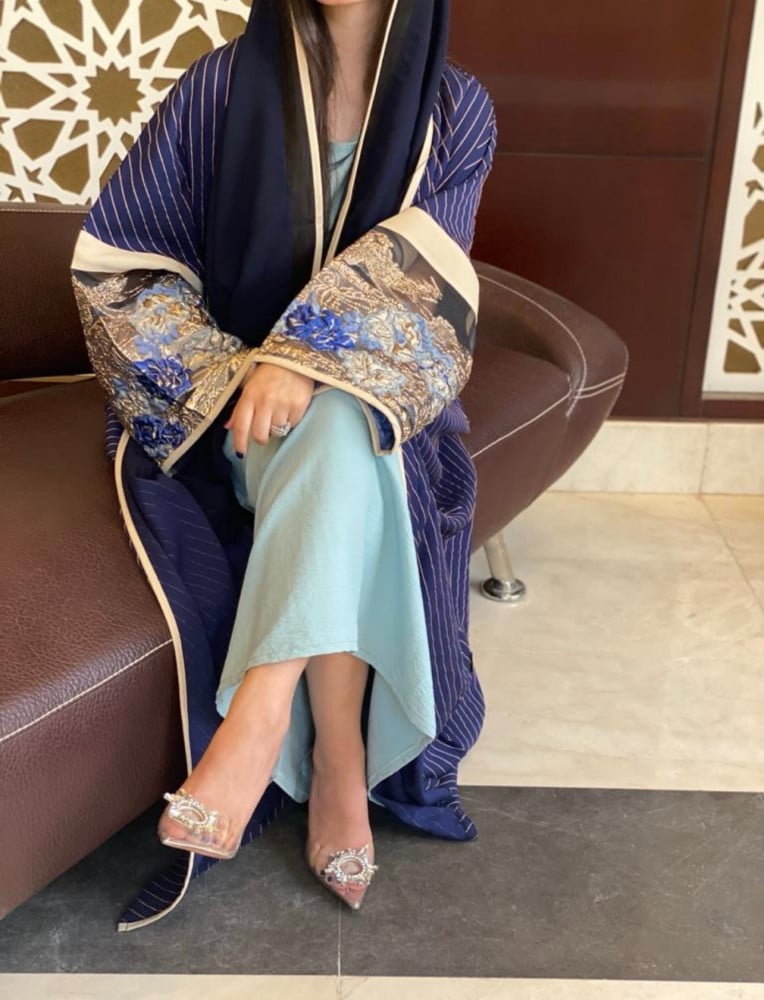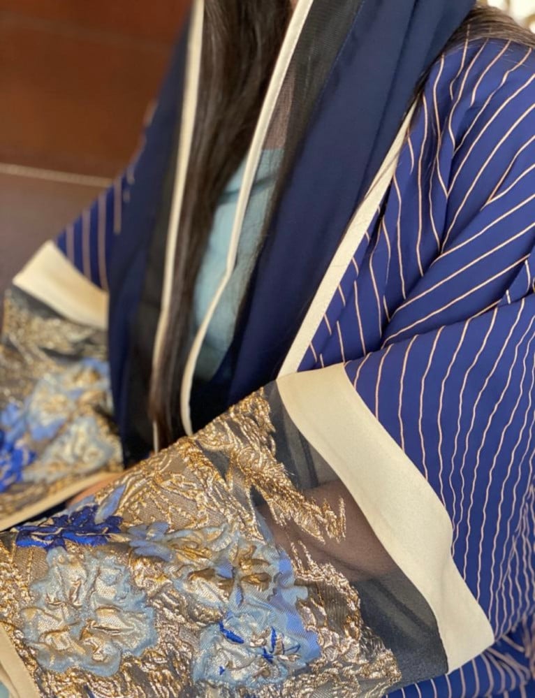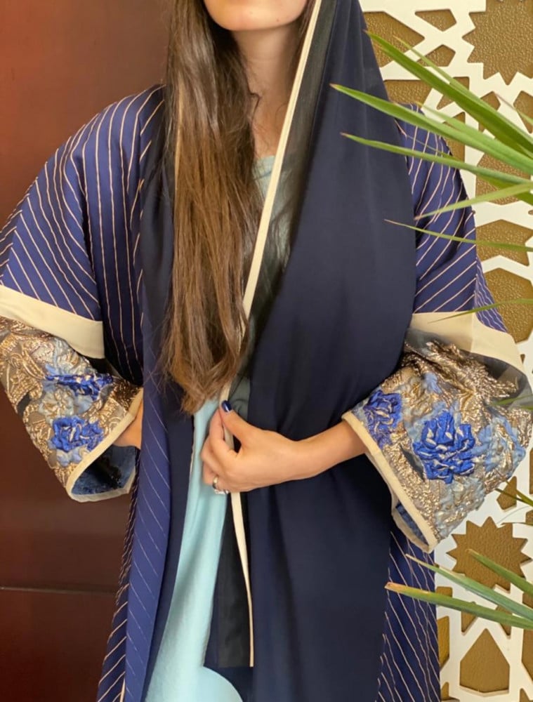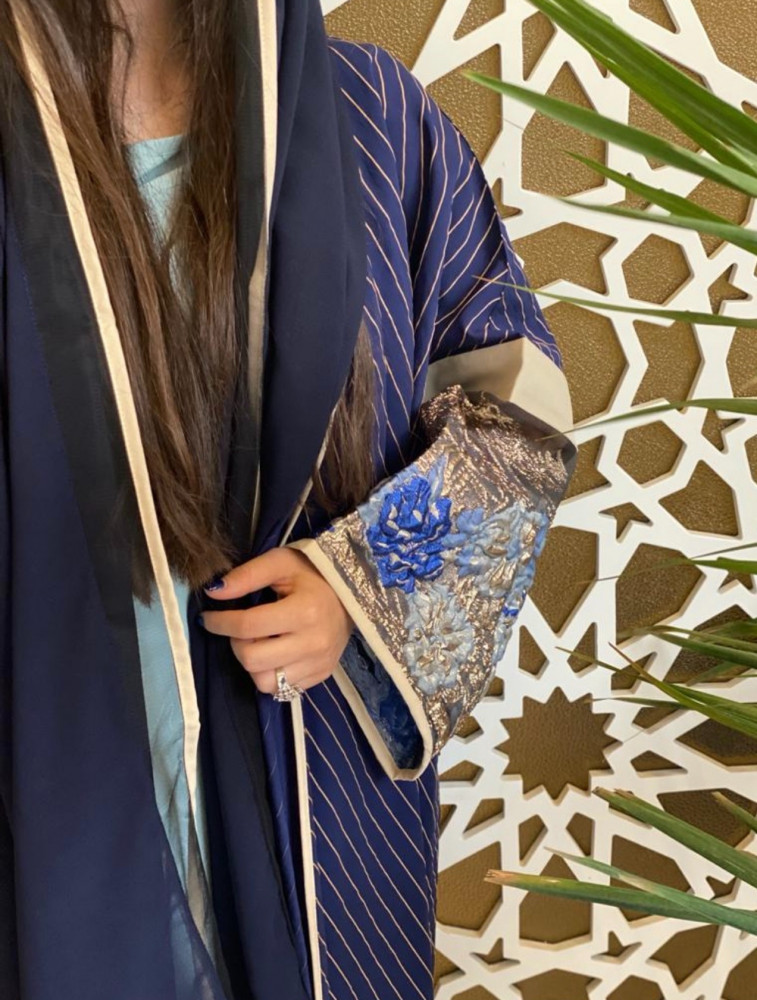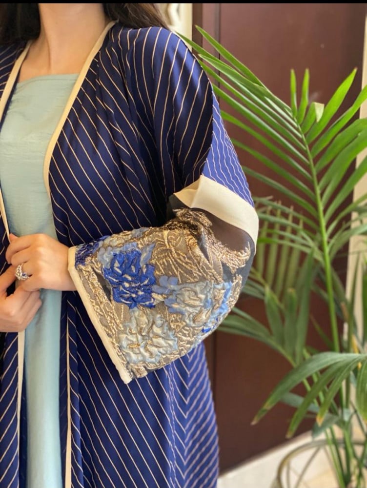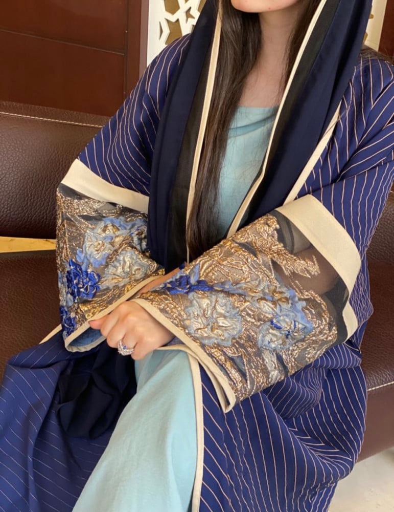 عباية فاخرة حرير مغسول مقلم ازرق والاكمام مشجرة