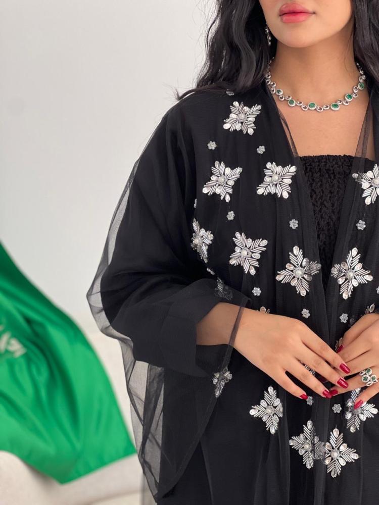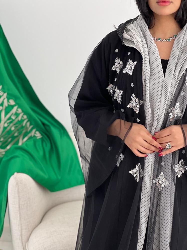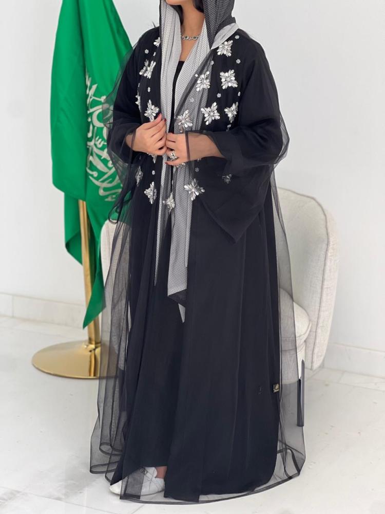 عباية فاخرة طبقتين كريب وتل اسود مع شك فضي