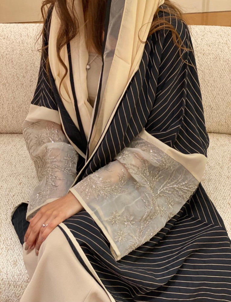 عباية فاخرة ومميزة اسود مقلم مع شك فضي