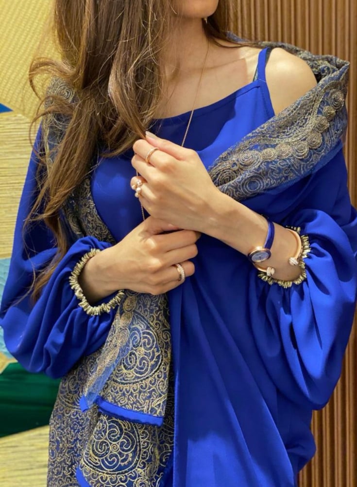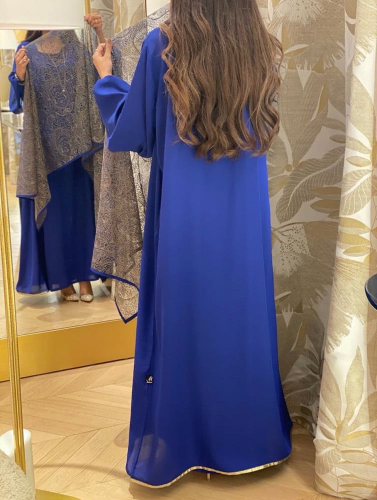 عباية كريب ازرق مع فستان داخلي وطرحه مشجر ذهبي