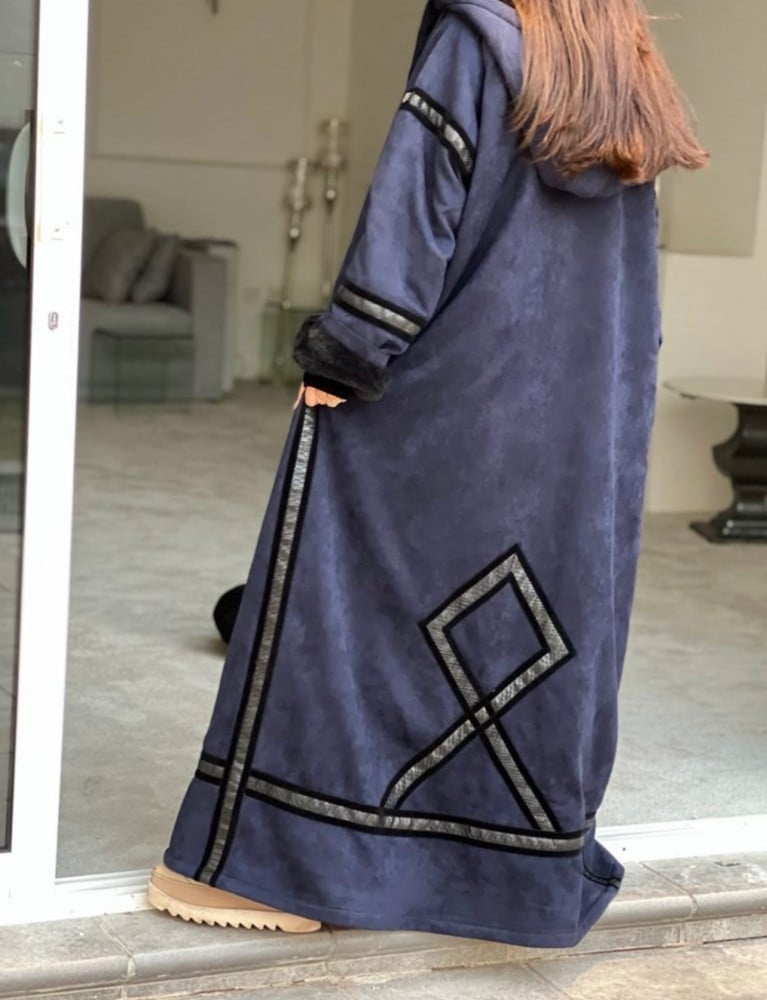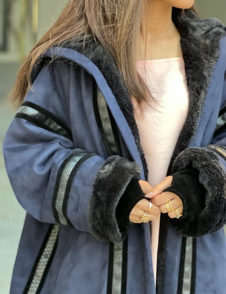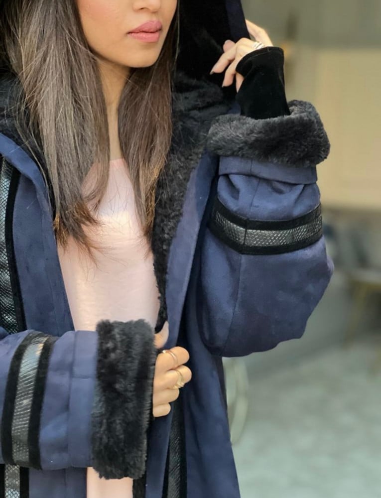 فروة عملية القماش شامواه كحلي محدده جلد ومخمل اسود ومبطنه بفرو اسود