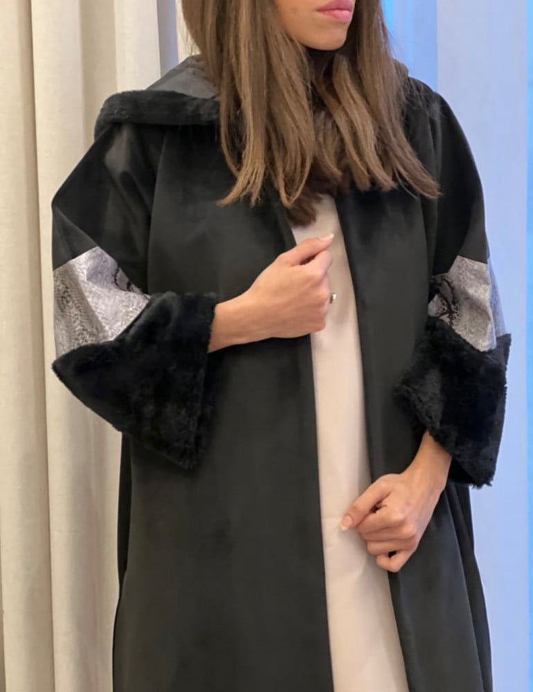 فروة فاخرة القماش جوخ اسود مع جلد رمادي وهودي ومبطنه بفرو اسود