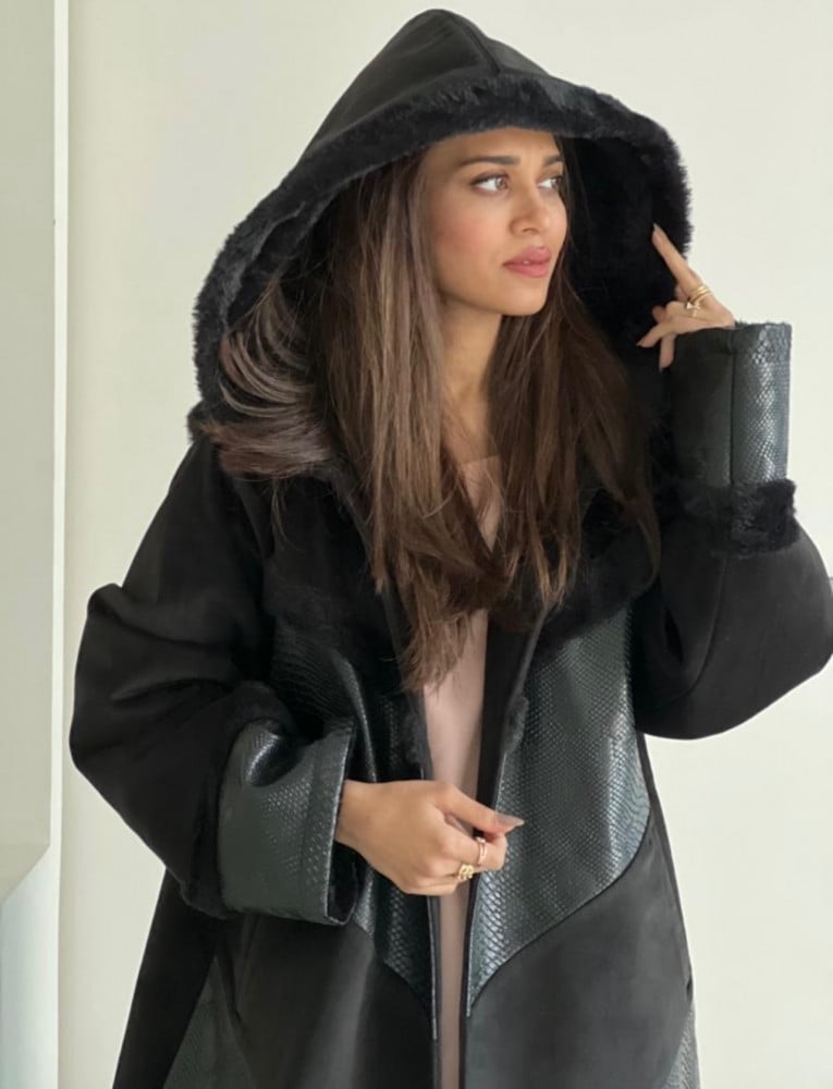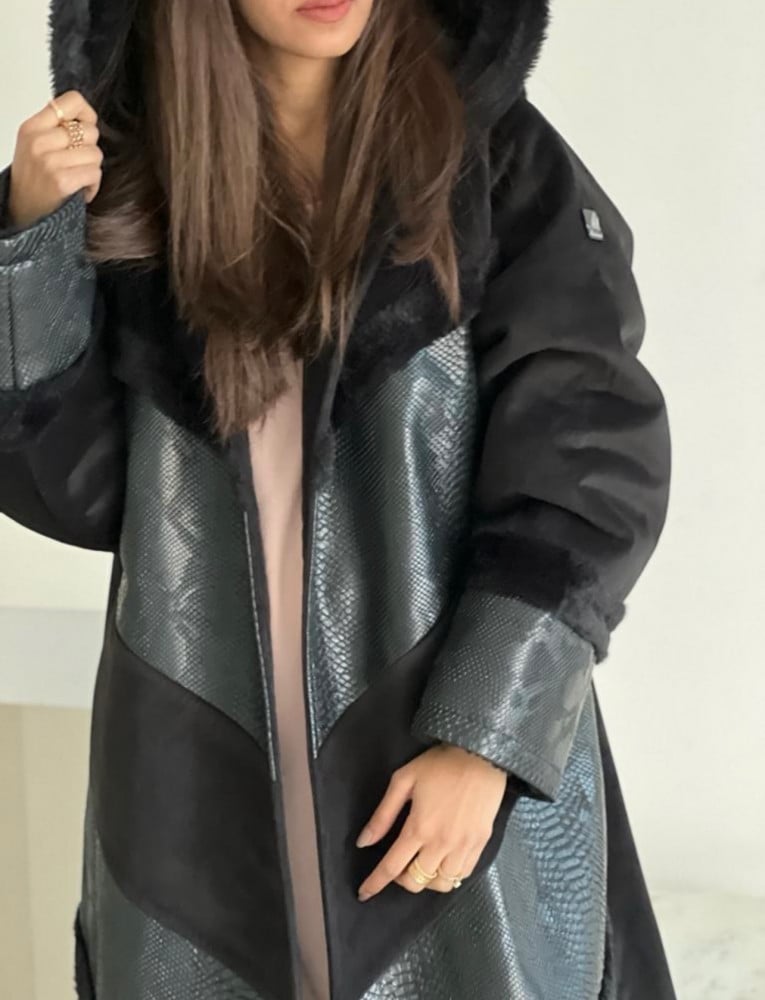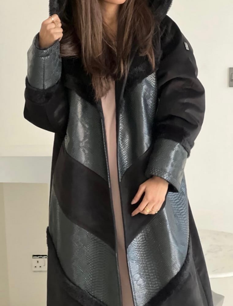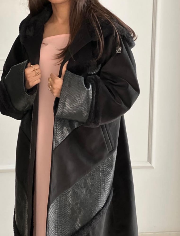 فروة فاخرة القماش جوخ اسود مع جلد ومبطنة بفرو اسود