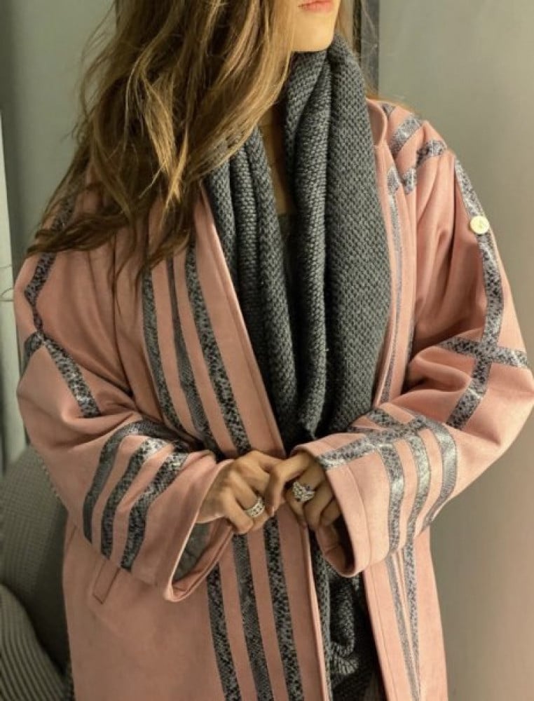 فروة فاخرة اللون وردي محدده بجلد رمادي ومبطنه بفرو رمادي