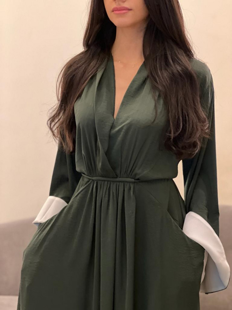عباية عملية اللون زيتي محددة مشجر وردي و...