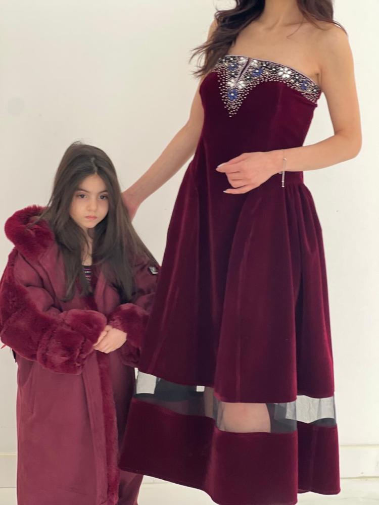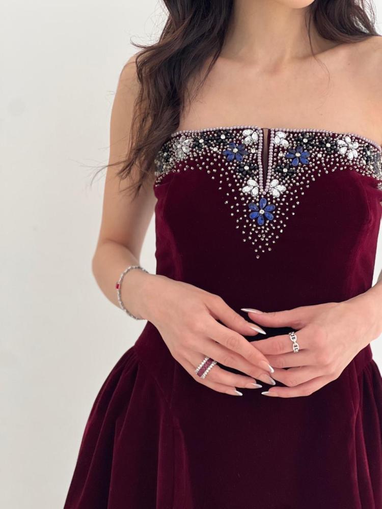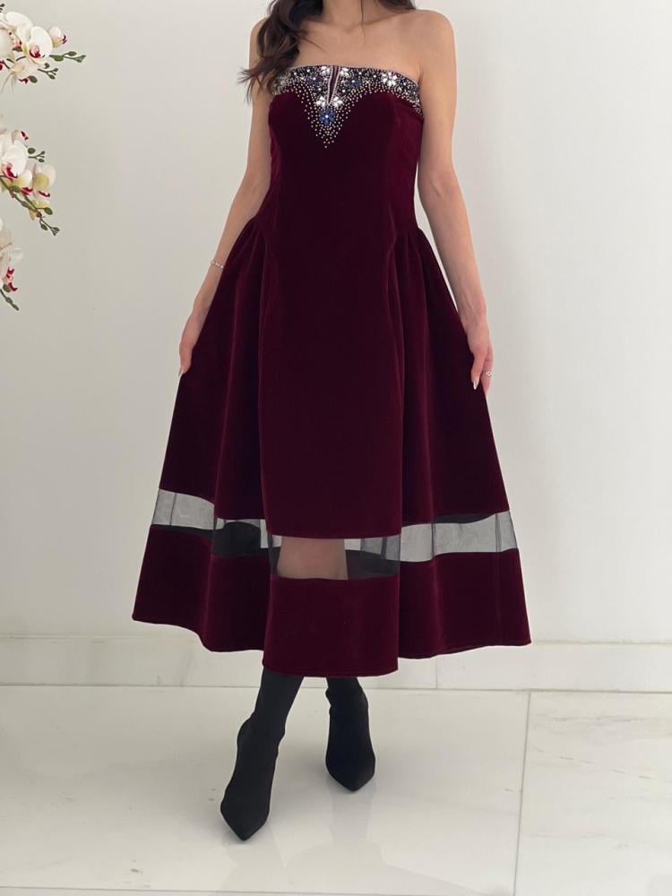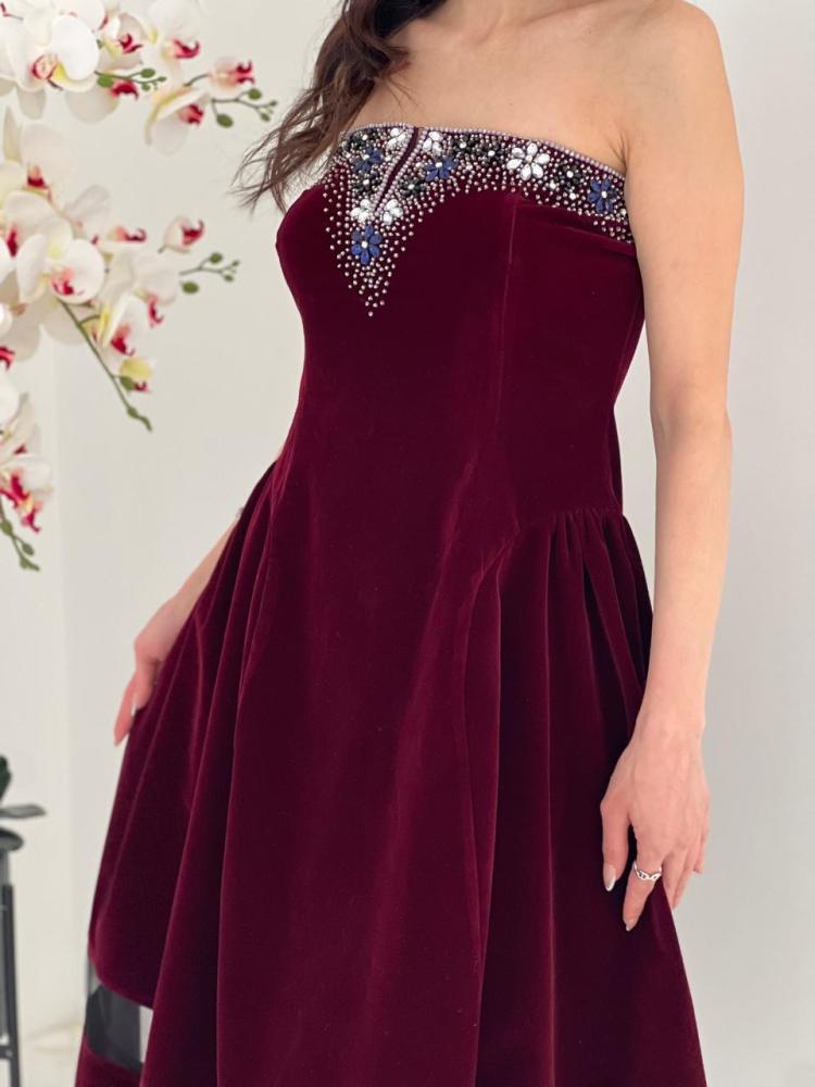 فستان فاخر القماش مخمل عنابي مع شك فضي