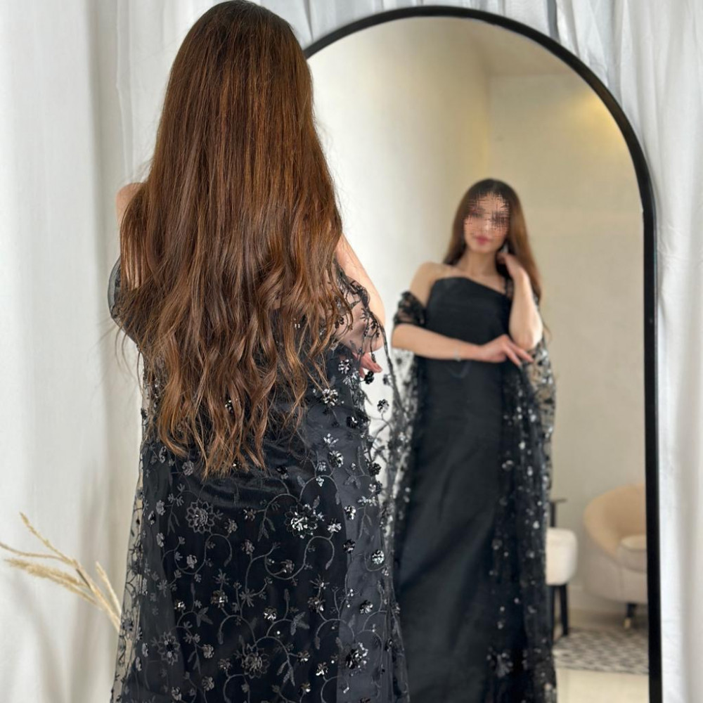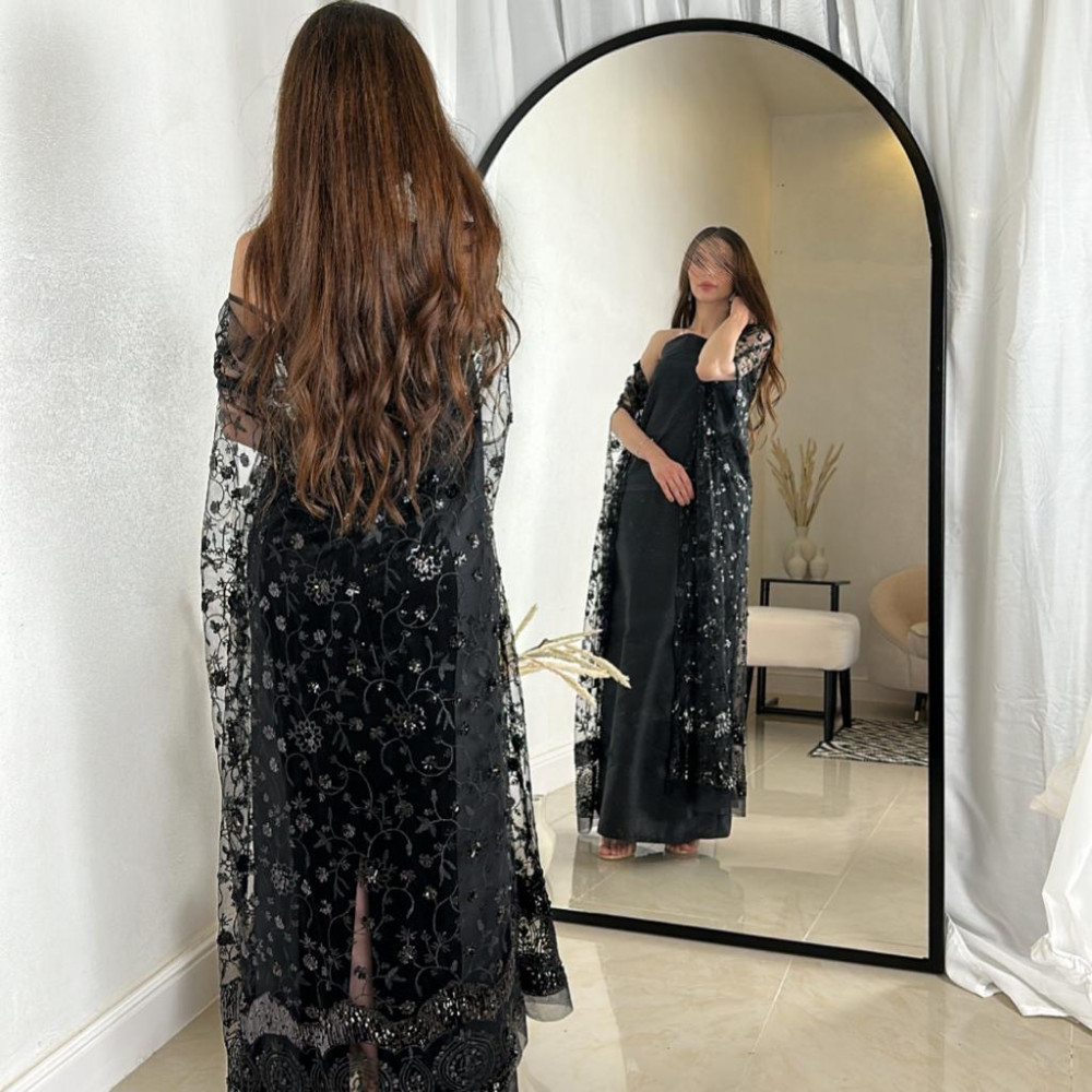 فستان فاخر اللون اسود مع تل مطرز اسود