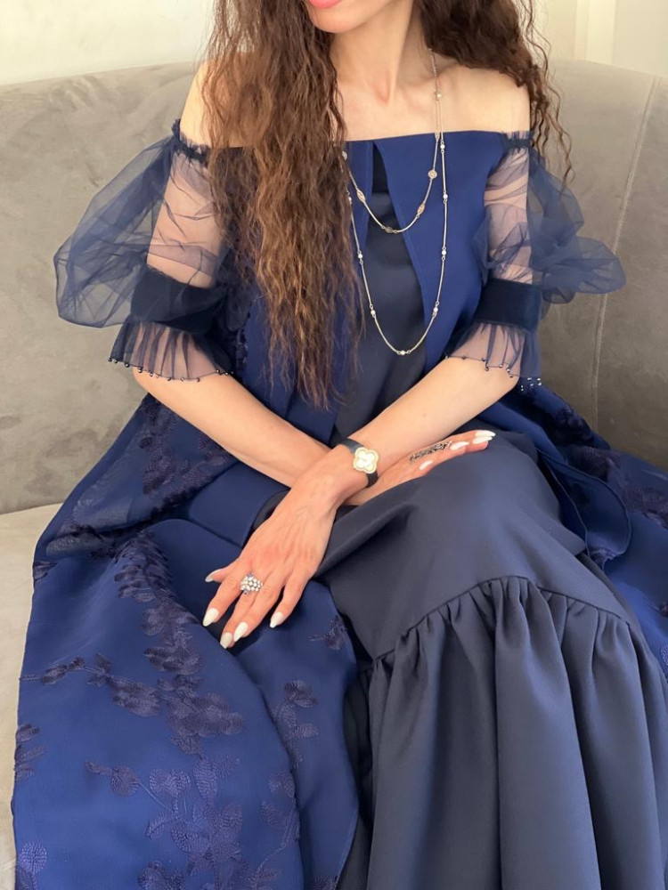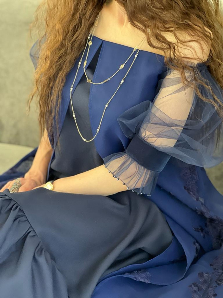 فستان فاخر اللون كحلي وعلى الاكمام شك كحلي