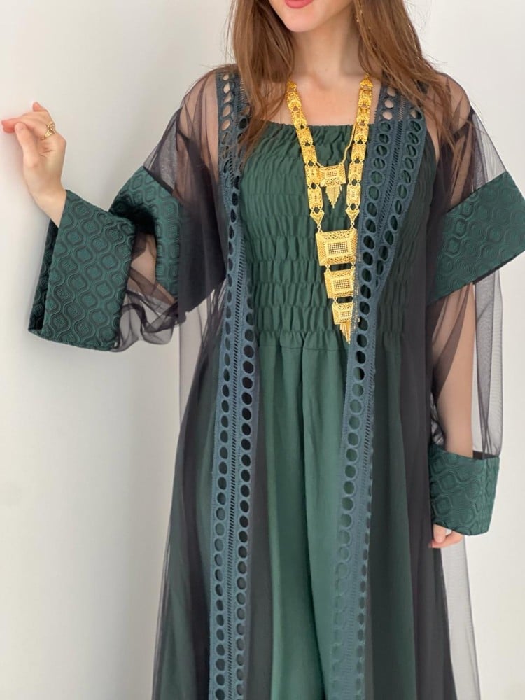 فستان فاخر قطعتين فستان دخلي اللون اخضر و وشاح
