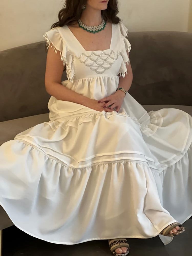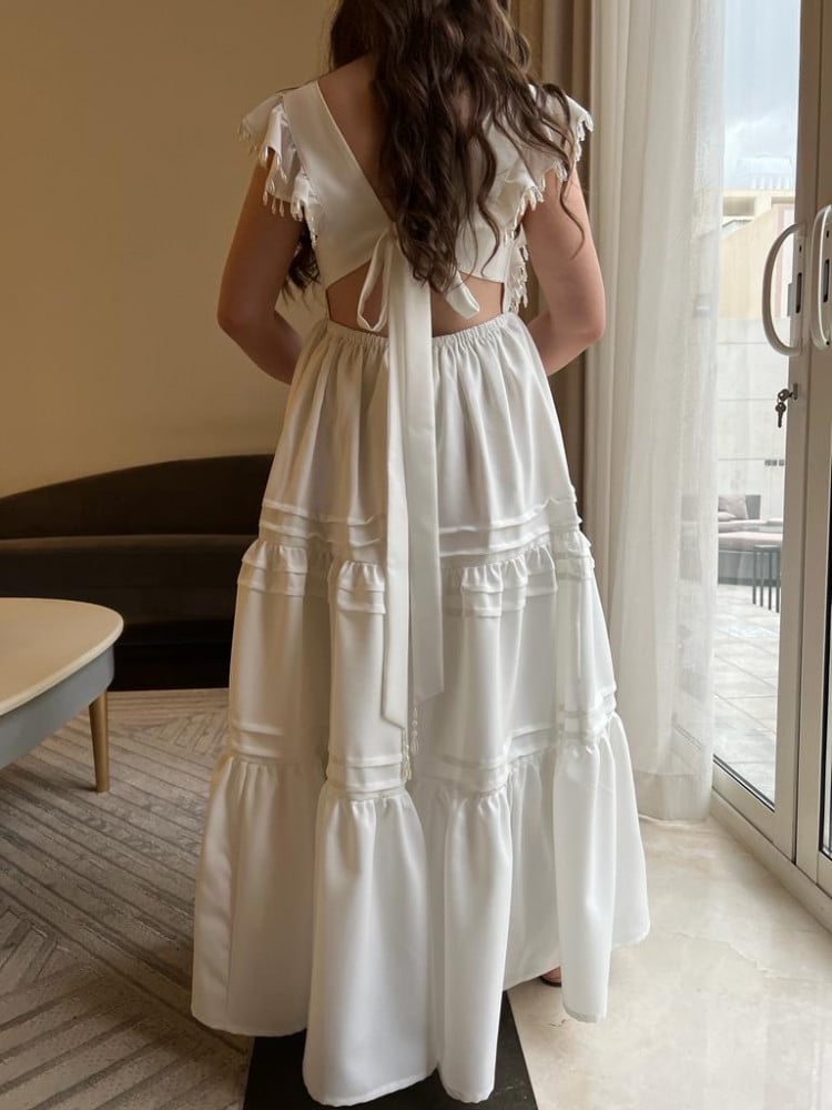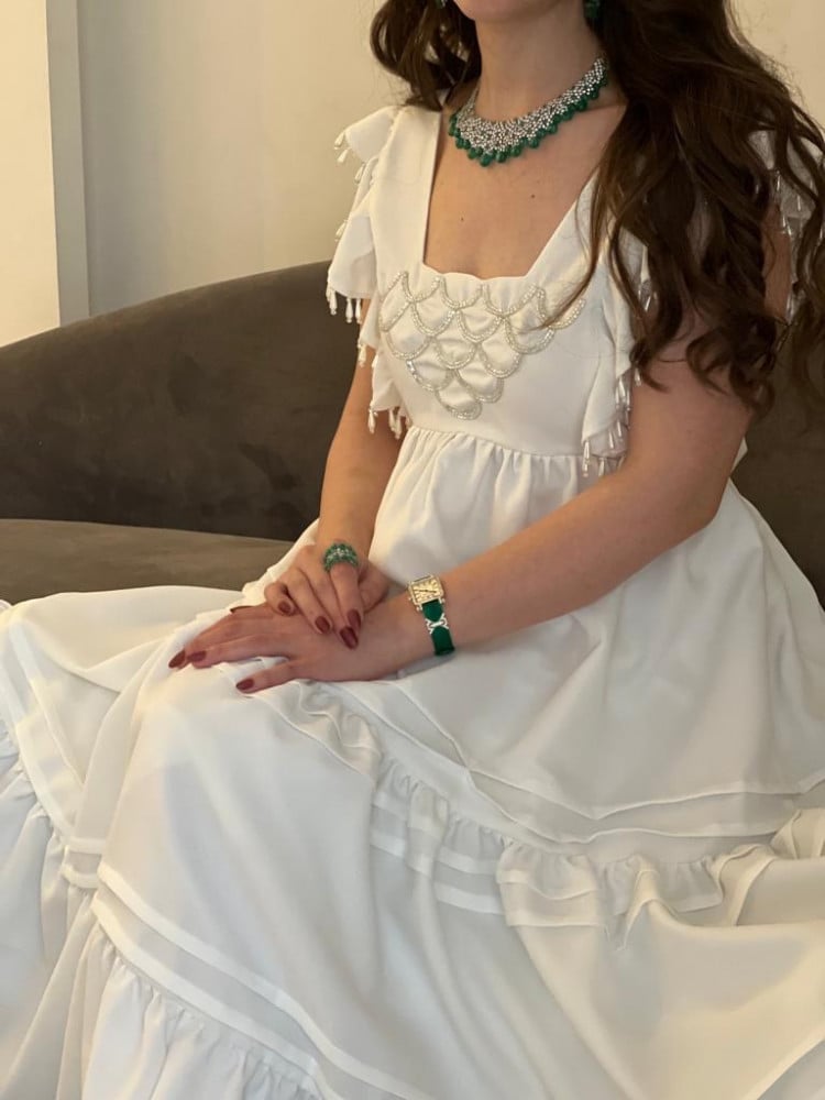 فستان فاخر مميز اللون سكري وعلى الصدر والأكمام شك