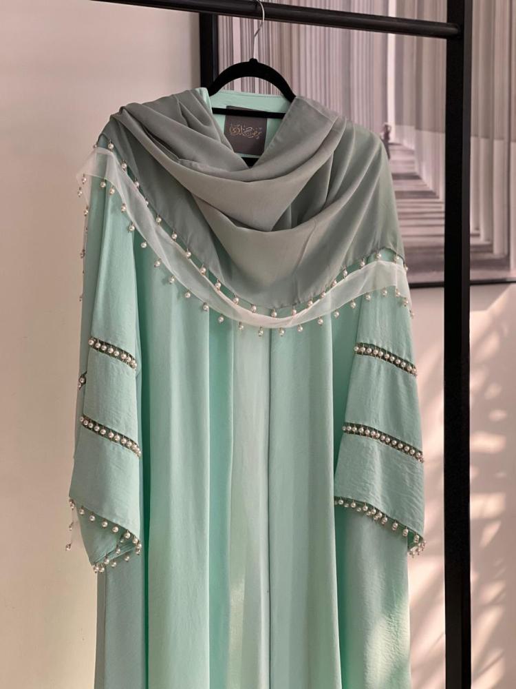 عباية كريب ازرق مع فستان داخلي وطرحه مشج...